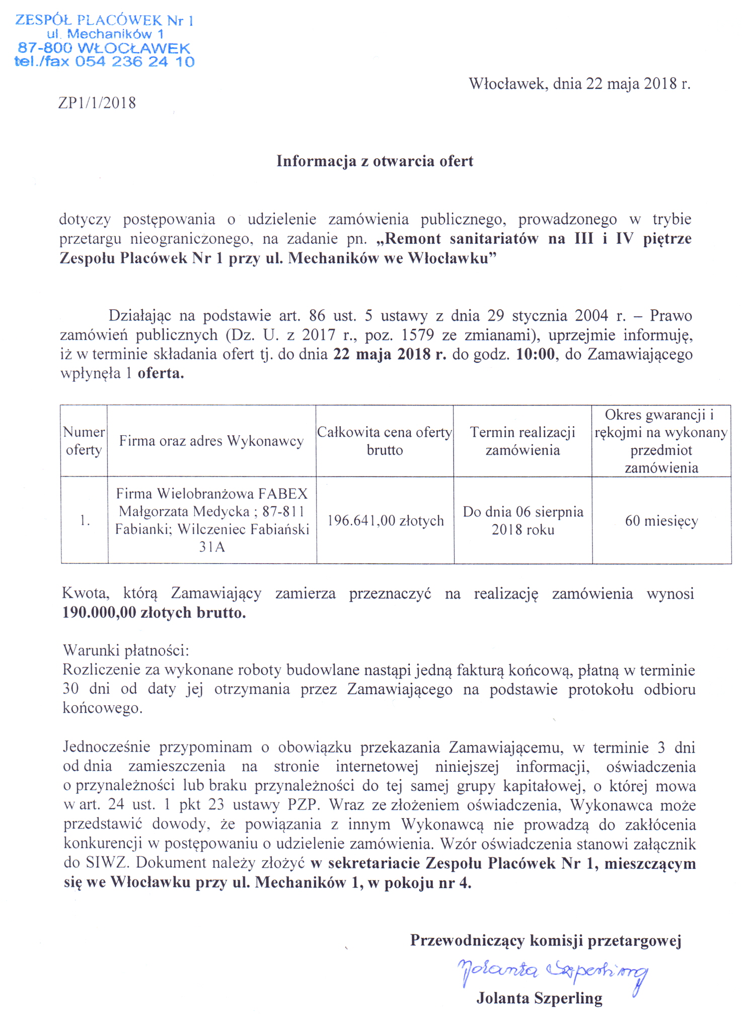 - Data składania ofert 22.05.2018